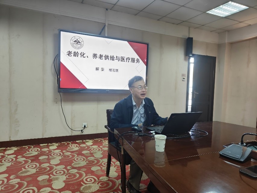 解垩教授首先详细阐述如何构建动态一般均衡世代交叠模型,从降低交易成本的视角,探讨智慧健康养老试点降低老年人医疗费用的作用机理。随后,重点梳理中国“智慧健康养老应用试点”的运营模式、试点范围、具体举措等,据此详细介绍实证研究设计和变量数据的相关内容。最后,对实证分析的基准结果、异质性分析、机制检验等内容进行详细分析。结合实证研究的结果,解教授对智慧健康养老这一新型养老模式如何通过降低就医成本、强化慢性病管理、促进预防锻炼等实现降低医疗费用的积极作用进行讨论,并对进一步完善和推广智慧健康养老试点的政策建议进行分析。此外,解教授还以“医养结合与退休决策”为主题探讨养老社会保障改革对老年人劳动供给决策的影响。与参会师生就延迟退休对劳动力市场的影响展开前瞻性讨论。