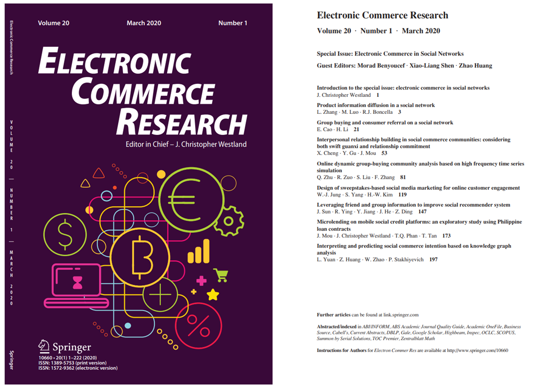 近日,由新葡萄官网沈校亮教授担任客座主编的SSCI期刊《Electronic Commerce Research》特辑(Special Issue)“Electronic Commerce in Social Networks”于2020年3月在该期刊第20卷第1期正式出版。