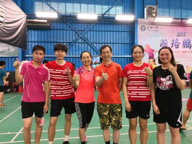 (武大羽毛球校队第一任会长朱代欢与小鲜肉组合合影留念)