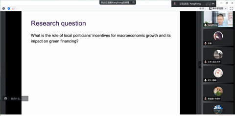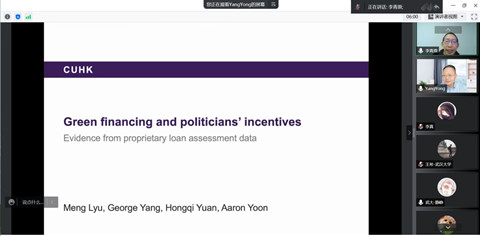 2022年11月17日上午,由新葡萄8883官网AMG会计系主办的蓝月亮珞珈论坛第98期在腾讯会议平台通过线上方式举行。论坛邀请了香港中文大学会计学院院长杨勇教授做题为“Green Financing and Politicians’ Incentives: Evidence from Proprietary Loan Assessment Data”的学术论文报告。论坛由会计系李青原教授主持,潘红波、周楷唐、赵良玉等多位老师和学生参加了此次论坛。