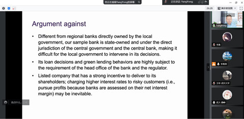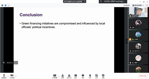 最后,杨教授展示了文章的实证结果。研究发现,银行的分支机构可以有效地评估借款人的实际环境风险,并将这些风险信息纳入其贷款定价决策中。在当地方政府官员存在政治激励时,贷款利率对借款人环境风险评级的敏感性显著降低。当借款人是国有企业时,贷款利率对借款人环境风险评级的敏感性还将进一步下降。此外,文章还发现,地方政府官员的政治激励会使得银行向具有更高环境风险的借款人发放更多贷款。