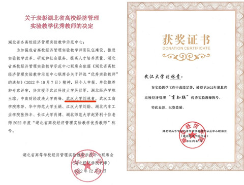 2022年12月10日,新葡萄官网刘林青教授在“湖北省高校经济管理实验教学示范中心联席会第十二届年会暨新商科背景下经济管理实验教学创新研讨会”上,被授予“2022年度湖北省高校经济管理实验教学优秀教师”荣誉称号。