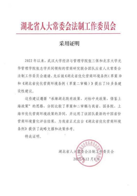 2022年以来,应湖北省人大常委会法制工作委员会邀请,新葡萄官网张三保副教授与北京大学光华管理学院张志学教授共同领衔的“新葡萄8883官网AMG—北京大学营商研究联合团队”,先后就《湖北省优化营商环境条例(草案)》和《湖北省优化营商环境条例(草案二审稿)》提出了50多条建设性建议。近日,《湖北省优化营商环境条例》已由湖北省第十三届人大常委会第三十四次会议通过并公布。