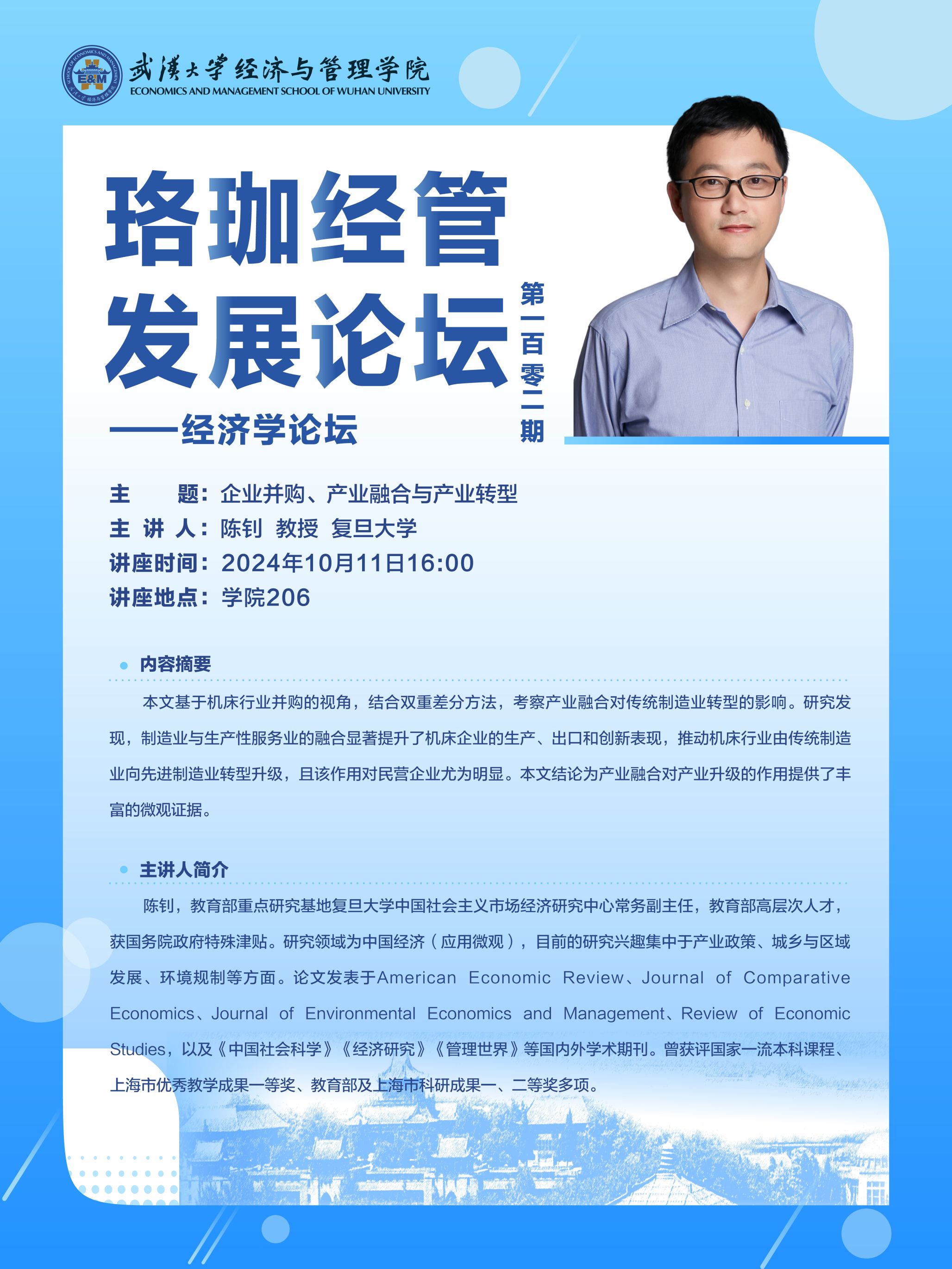 讲座预告 | 珞珈经管发展论坛第一百零二期——经济学论坛